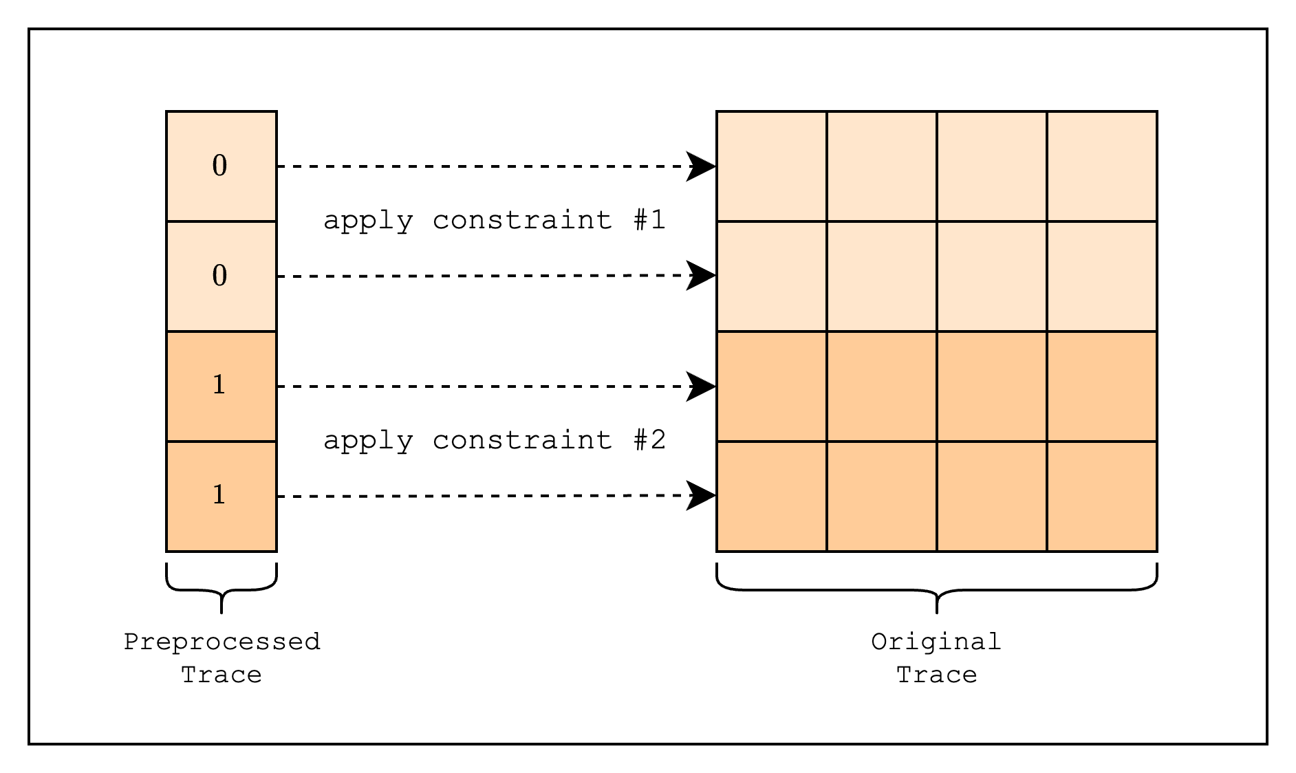 This section and the following sections are intended for developers who have completed the First Breath of AIR section or are already familiar with the workflow of creating an AIR. If you have not gone through the previous section, we recommend doing so first as the following sections gloss over a lot of boilerplate code.For those of you who have completed the First Breath of AIR tutorial, you should now be familiar with the concept of a trace as a table of integers that are filled in by the prover (we will now refer to this as the original trace). In addition to the original trace, S-two also has a concept of a preprocessed trace, which is a table whose values are fixed and therefore cannot be arbitrarily chosen by the prover. In other words, these are columns whose values are known in advance of creating a proof and essentially agreed upon by both the prover and the verifier. One of the use cases of the preprocessed trace is as a selector for different constraints. Remember that in an AIR, the same constraints are applied to every row of the trace? If we go back to the spreadsheet analogy, this means that we can’t create a spreadsheet that runs different computations for different rows. To get around this, note that if we multiply a constraint with a “selector” that is zero, the constraint will be trivially satisfied. Building on this, we can create a selector column of 0s and 1s, and multiply the constraint with the selector column. For example, let’s say we want to create a constraint that runs different computations for the first 2 rows and the next 2 rows. We can do this by creating a selector column that has value 0 for the first 2 rows and 1 for the next 2 rows and combining it with the constraints as follows: