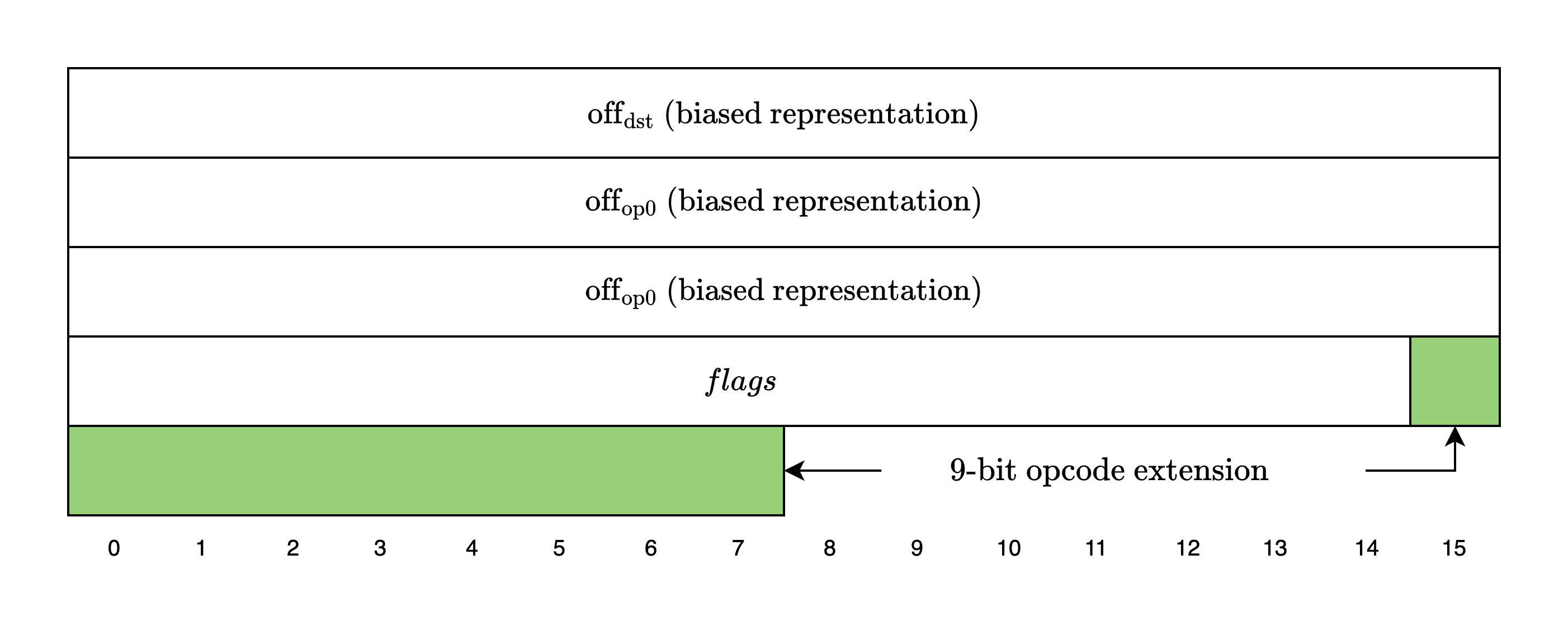 Since the 64-bit instruction structure is not flexible enough to support this extended set of opcodes, Cairo extends the instruction size to 72 bits and uses the last 9 bits as the opcode extension value.