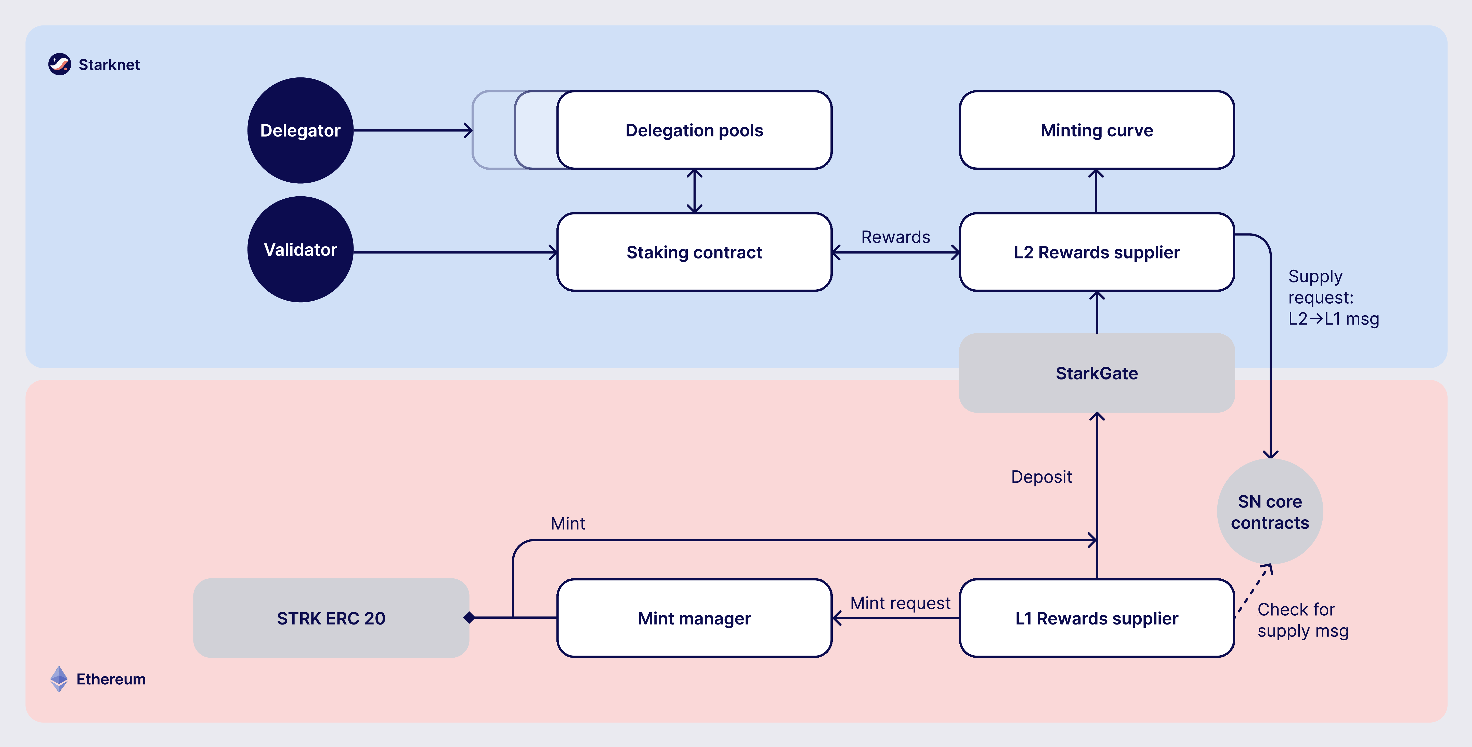 The implementation of Starknet’s staking protocol is divided into several contracts, summarized in the following figure: