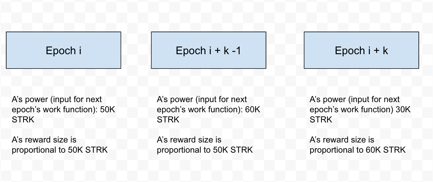 Starting from its second phase, the staking protocol introduces the notion of epochs (similarly to many other protocols). Epochs represent checkpoints, such that changes made in epoch are applied in epoch , where is a new latency parameter. For example, the following figure illustrates a scenario where in epoch validator has 50K STRK staked and someone delegates an additional 10K STRK to them, and in epoch someone undelegates 30K STRK from :
