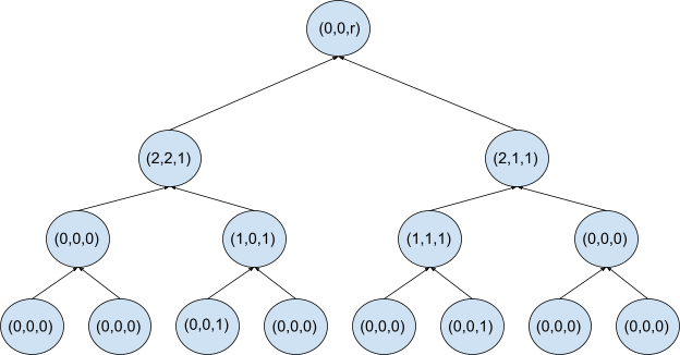 Where r=hPed(H(2,2,1),H((2,1,1))r = h_{P e d} \left(\right. H \left(\right. 2 , 2 , 1 \left.\right) , H \left(\right. \left(\right. 2 , 1 , 1 \left.\right) \left.\right). Notice that the example does not skip from the root, whose length is zero, so the final state commitment to the trie is H((0,0,r))=rH \left(\right. \left(\right. 0 , 0 , r \left.\right) \left.\right) = r. Suppose that you want to prove, with respect to the state commitment just computed, that the value of the leaf whose path is given by 101101 is 11. In a standard Merkle trie, the proof would consist of data from three nodes, which are siblings along the path to the root. In a Merkle-Patricia trie, because the trie is sparse, you only need to send the two children of the root, which are (2,2,1)\left(\right. 2 , 2 , 1 \left.\right) and (2,1,1)\left(\right. 2 , 1 , 1 \left.\right). These two children are enough to reproduce the state commitment rr, and because you know that the height of the trie is three, and that it is fixed, you know that the path 0101 of length 22 specified by the right-hand child, (2,1,1)\left(\right. 2 , 1 , 1 \left.\right), leads to the desired leaf.